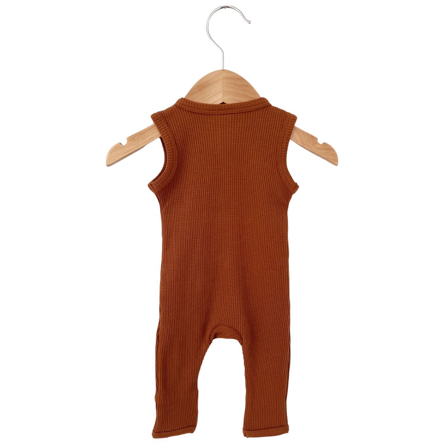 This sleeveless, fitted one-piece for baby can be worn all spring and summer long. Wear on its own as an outfit or pair with a denim jacket or cardigan. The front zipper makes for easy diapering and dressing. Presented on our best-selling and super soft organic cotton waffle in caramel color, this romper is a playful baby basic for any Spearmint Baby.